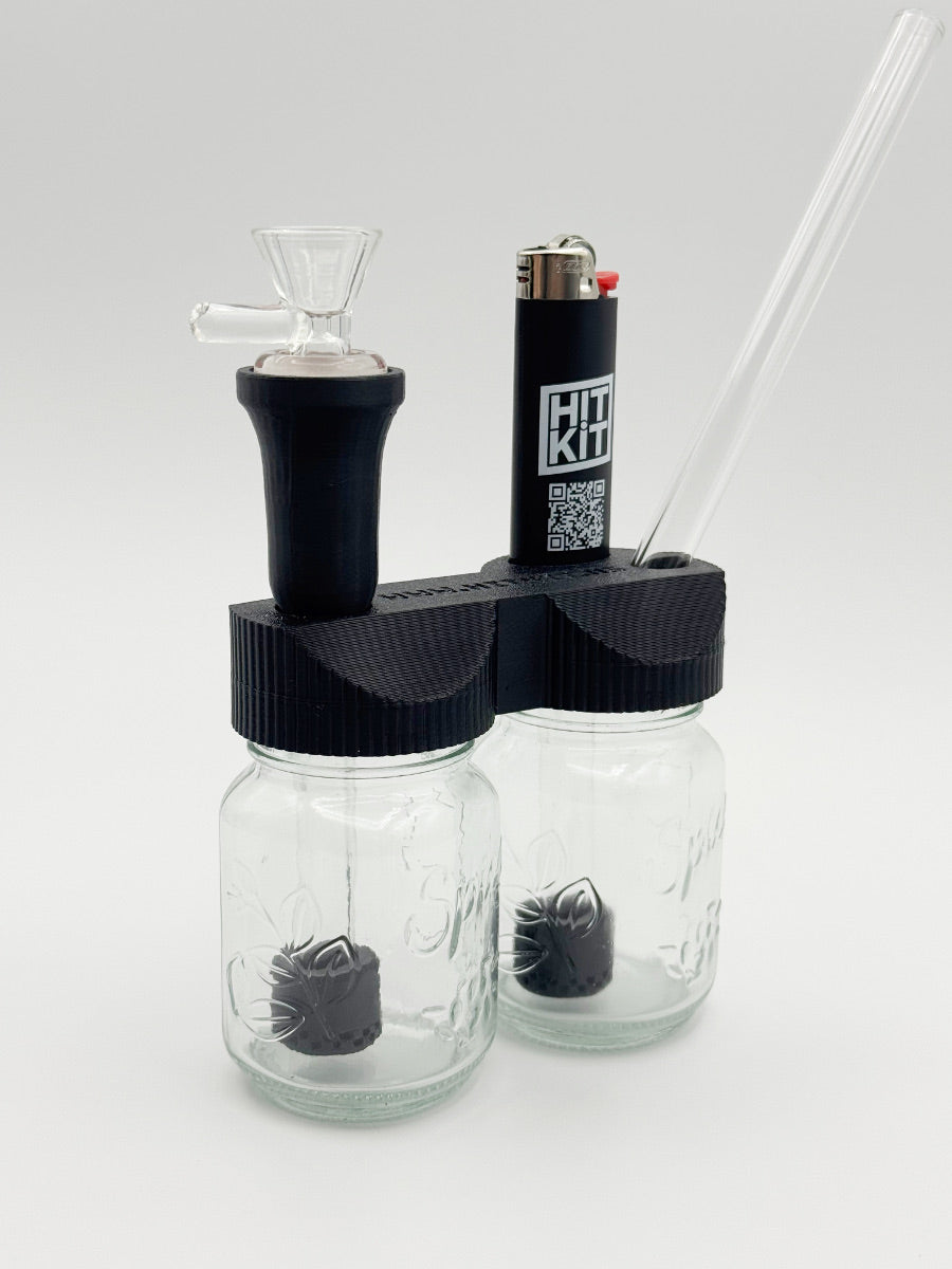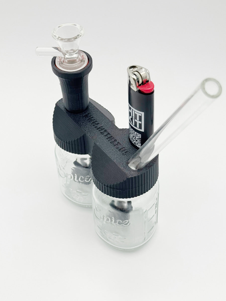 Version 2 is here and it surpasses its precursor in every way. The Dub Bub v2 combines two 4oz mini mason jars into a super-smooth hitting pipe. Your smoke gets percolated twice prior to exiting the pipe through its glass mouth piece. A convenient parking spot for your BIC lighter is built in to the Dub Bub's top.